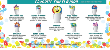Fun Combinations: AngryBirds* GrimReaper* American Dream* S'more Spiced Apple Cider* Any three flavor Rainbow